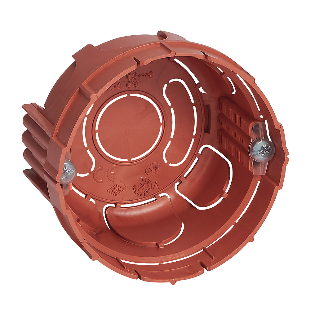 Boîte monoposte Batibox pour cloisons sèches pour appareillage Céliane ou Mosaic 1 module profondeur 40mm - avec étriers de serrage rétractables, large collerette et nombreuses entrées pour passage de gaines, défonçables sans outil