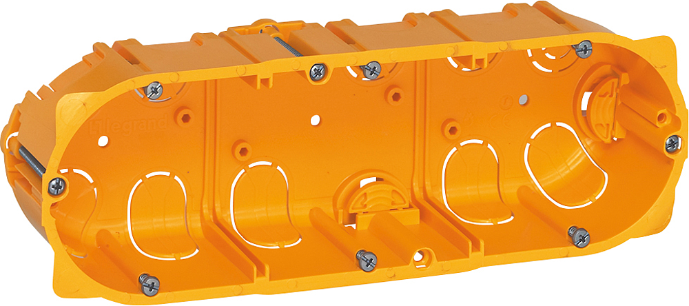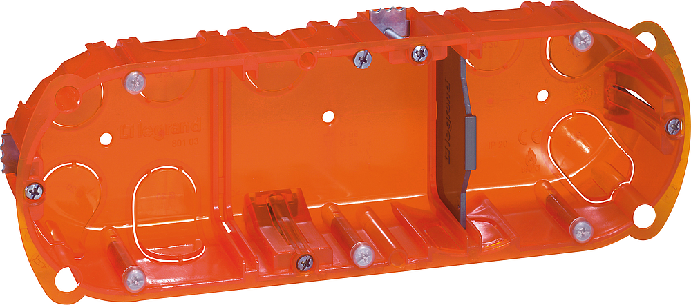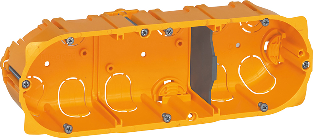 Boîte multiposte Batibox pour cloisons sèches 3 postes ou 6 à 8 modules profondeur 40mm pour appareillage à vis ou à griffes - avec étriers de serrage rétractables et nombreuses entrées pour passage de gaines, défonçables sans outil
