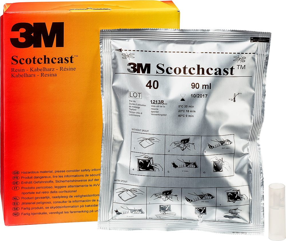 La résine Scotchcast™ n° 40 est une résine polyuréthane bi-composants, polymérisable à température ambiante, conditionnée dans un sachet thermo-soudé équipé d’un embout auto-perforant.