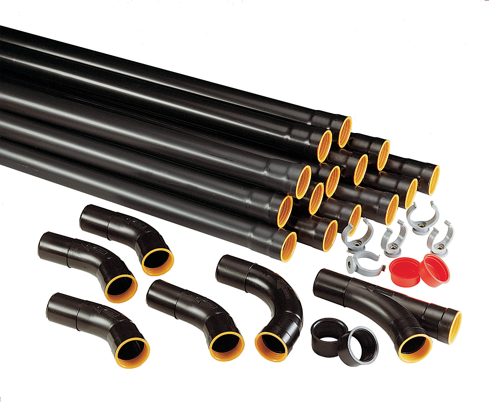 Kit d'installation pour système de flexible rétractable pour mur en brique(prise d'aspiration, contre-prise, conduits d'aspiration, coudes 90°, coudes 45°, coudes 22,5°, manchons, colliers, poingée, flexible)
